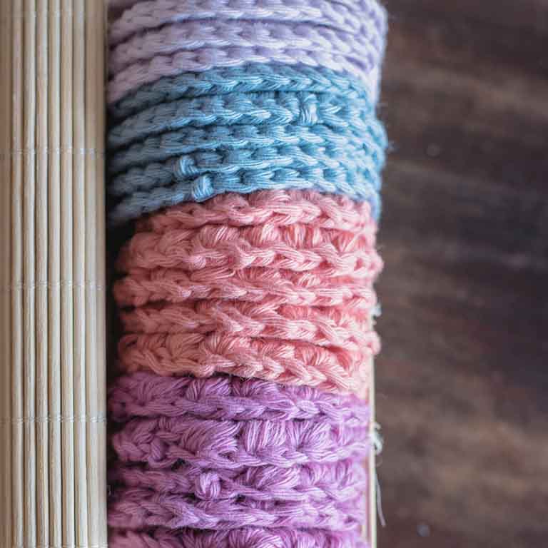 Είναι χειροποίητα, φτιαγμένα από 100% βαμβακερό νήμα και πλεγμένα με το βελονάκι. Πλένονται στο πλυντήριο στους 40 βαθμούς και μπορούν να στεγνώσουν και σε στεγνωτήριο. Επαναχρησιμοποιούνται ξανά και ξανά καθώς είναι ιδιαίτερα ανθεκτικά!